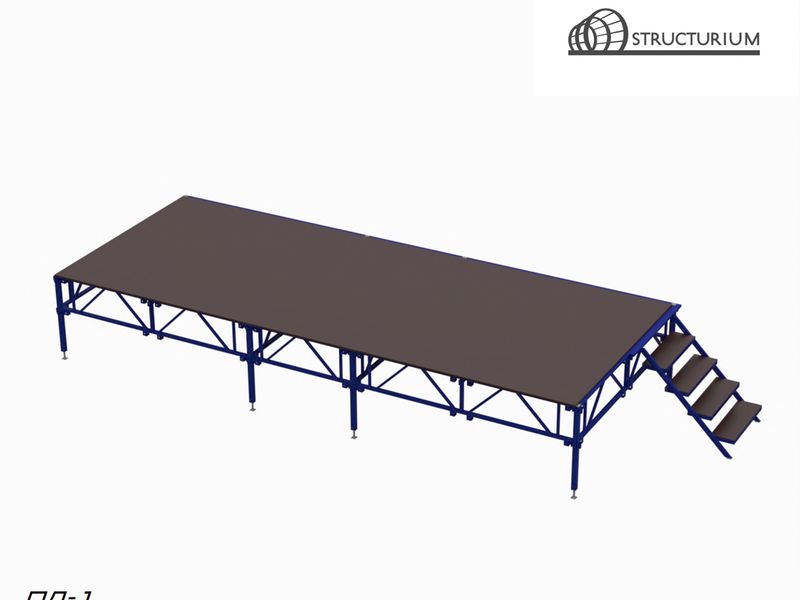 При производстве Подиума используется профильная труба 50*50*3мм, 50*25*2мм, 40*25*2мм, 25*25*2мм. Панели пола изготавливаются из влагостойкой ламинированной фанеры 21мм с антискользящим покрытием. Покраска полимерная порошковая с предварительным нанесением цинкосодержащего грунта, цвет синий.